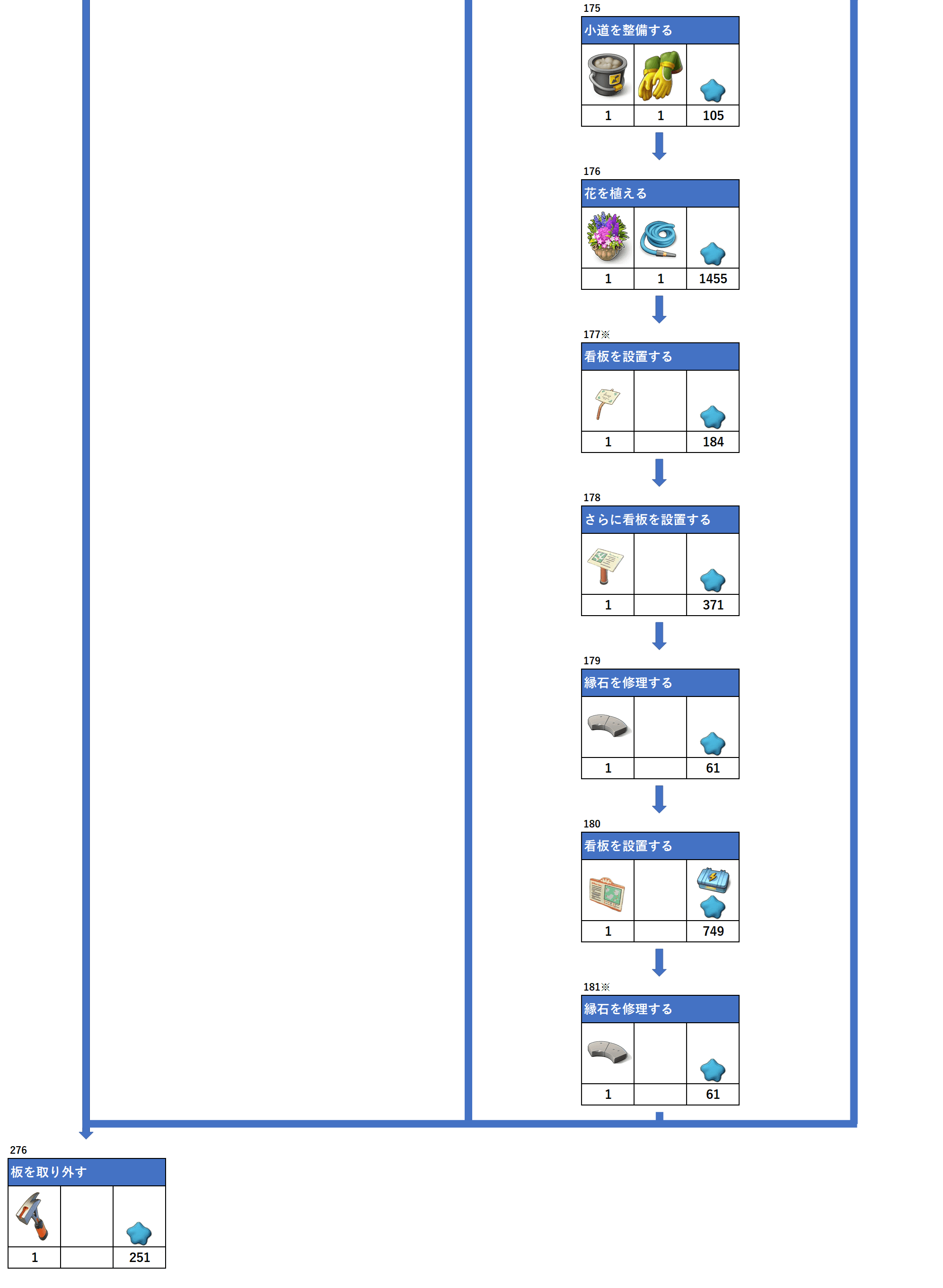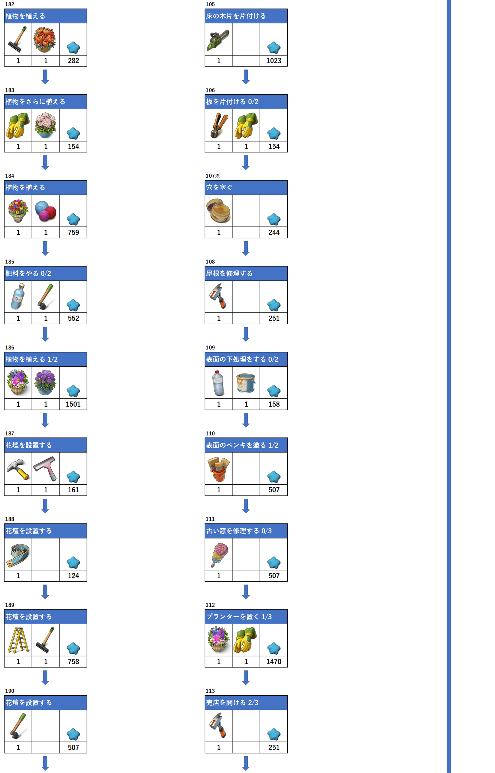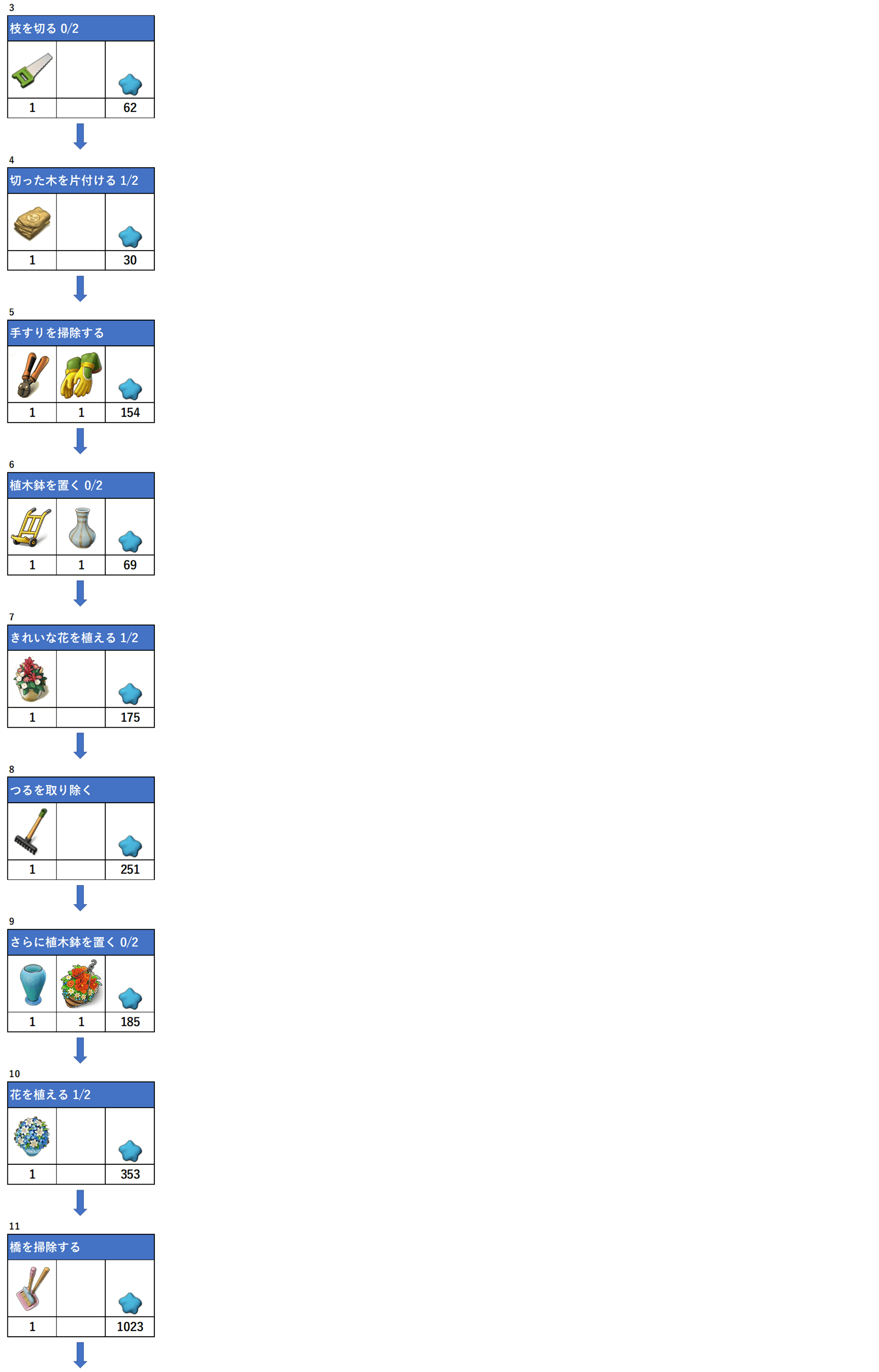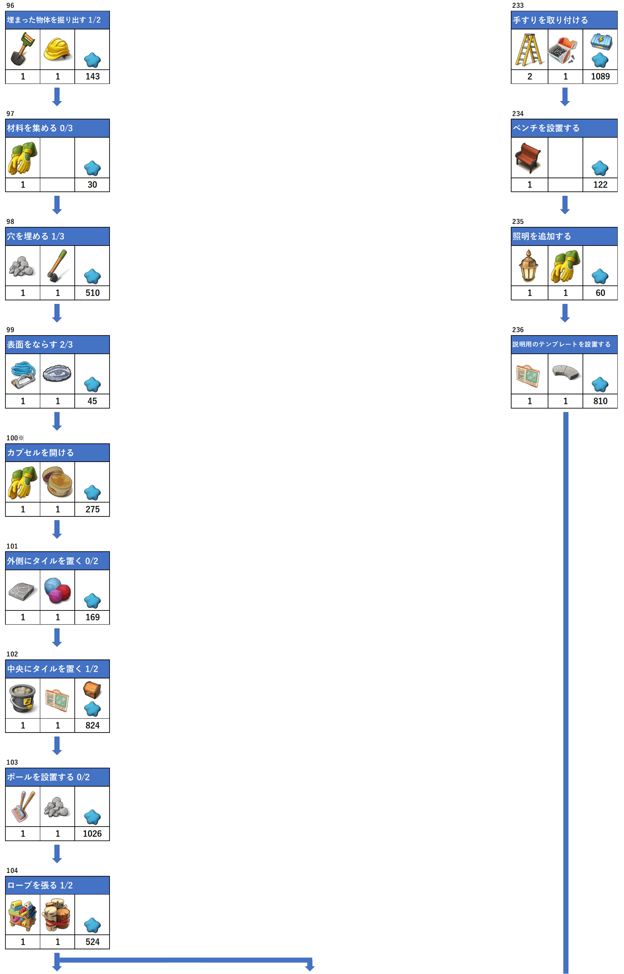 アイテムの下にある数字は必要数、一番右枠は報酬となります。