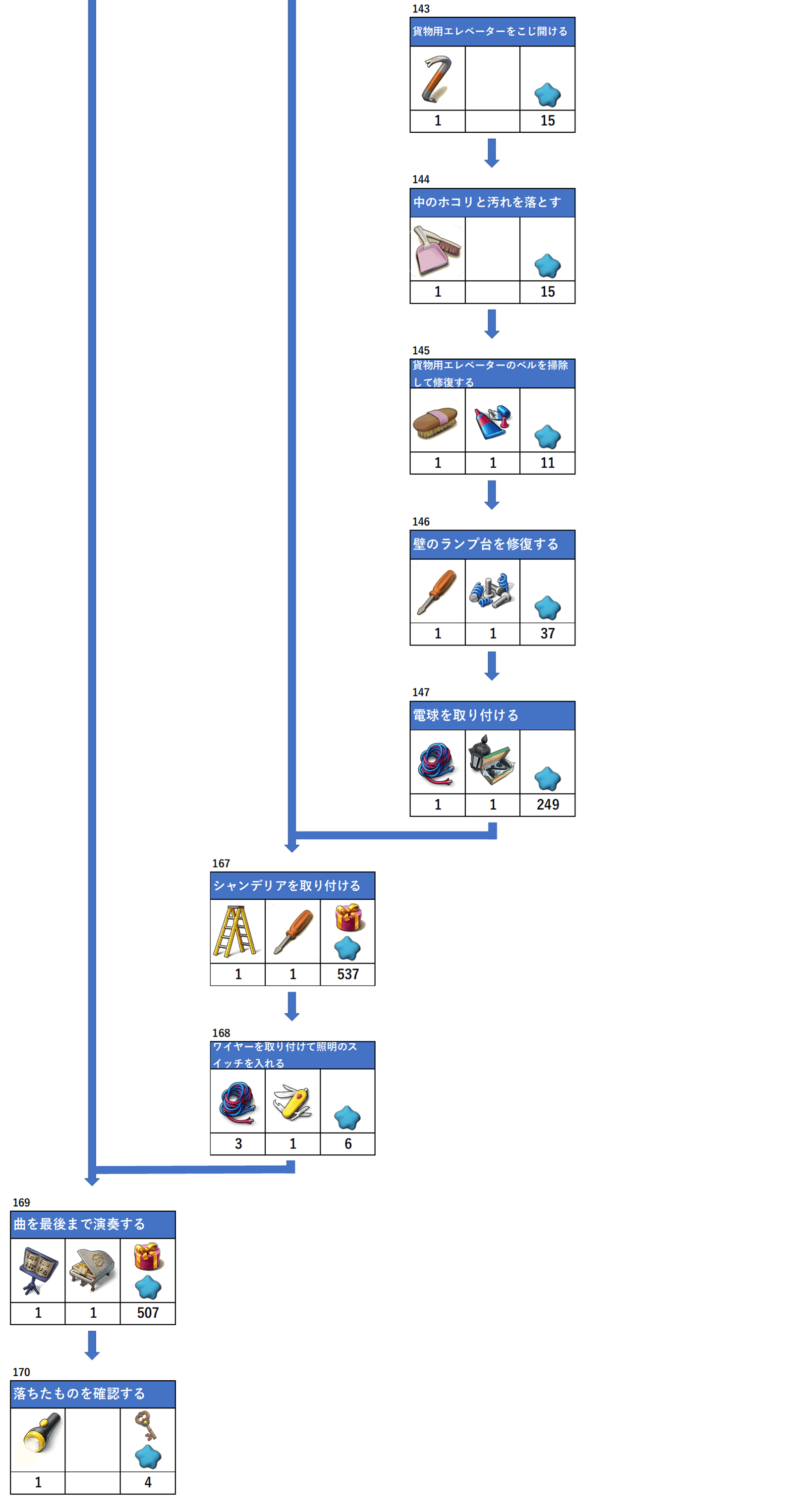 マージマンション(Merge Mansion)のエリア、ダイニングルームの攻略用フローチャートとアイテム必要数です。