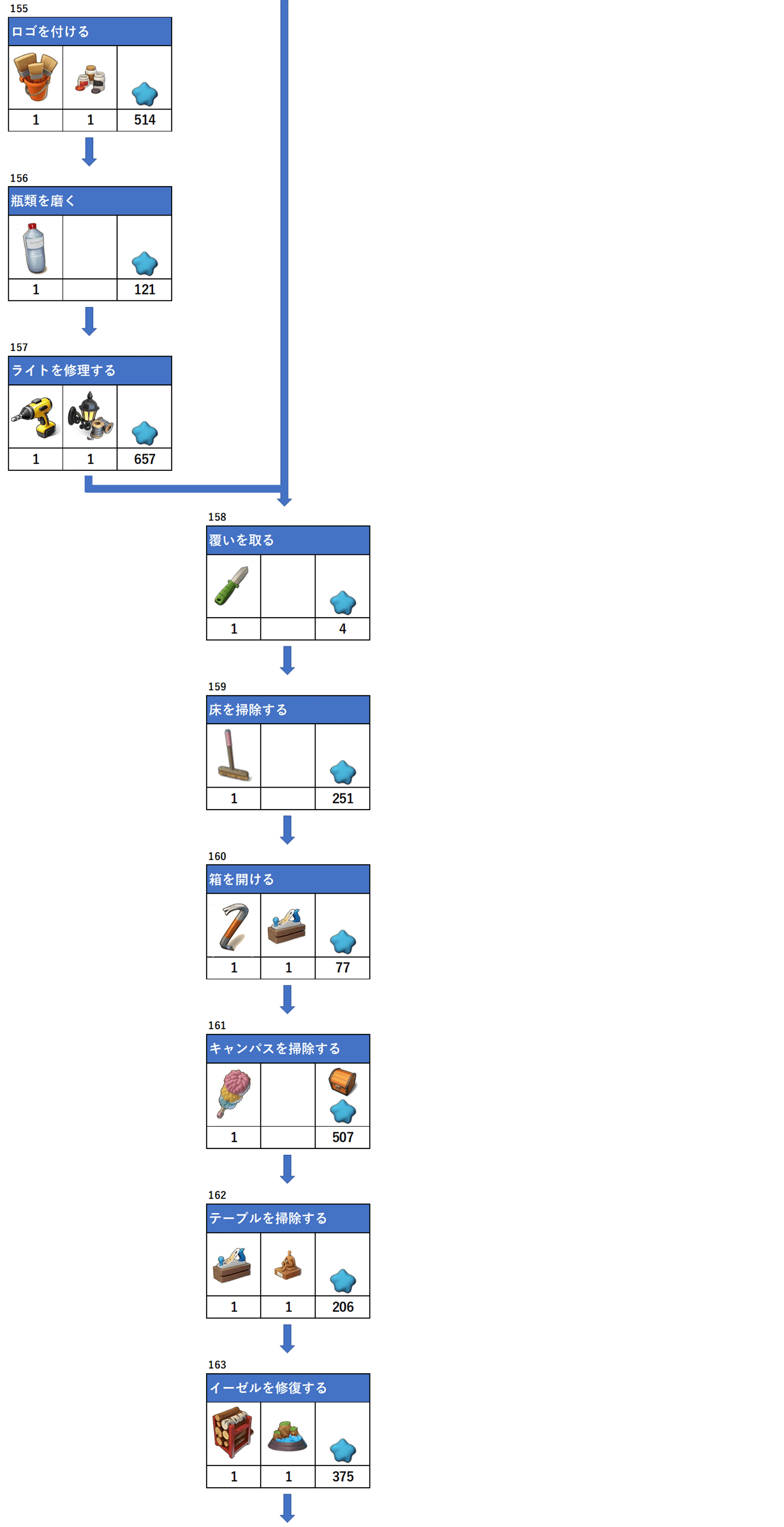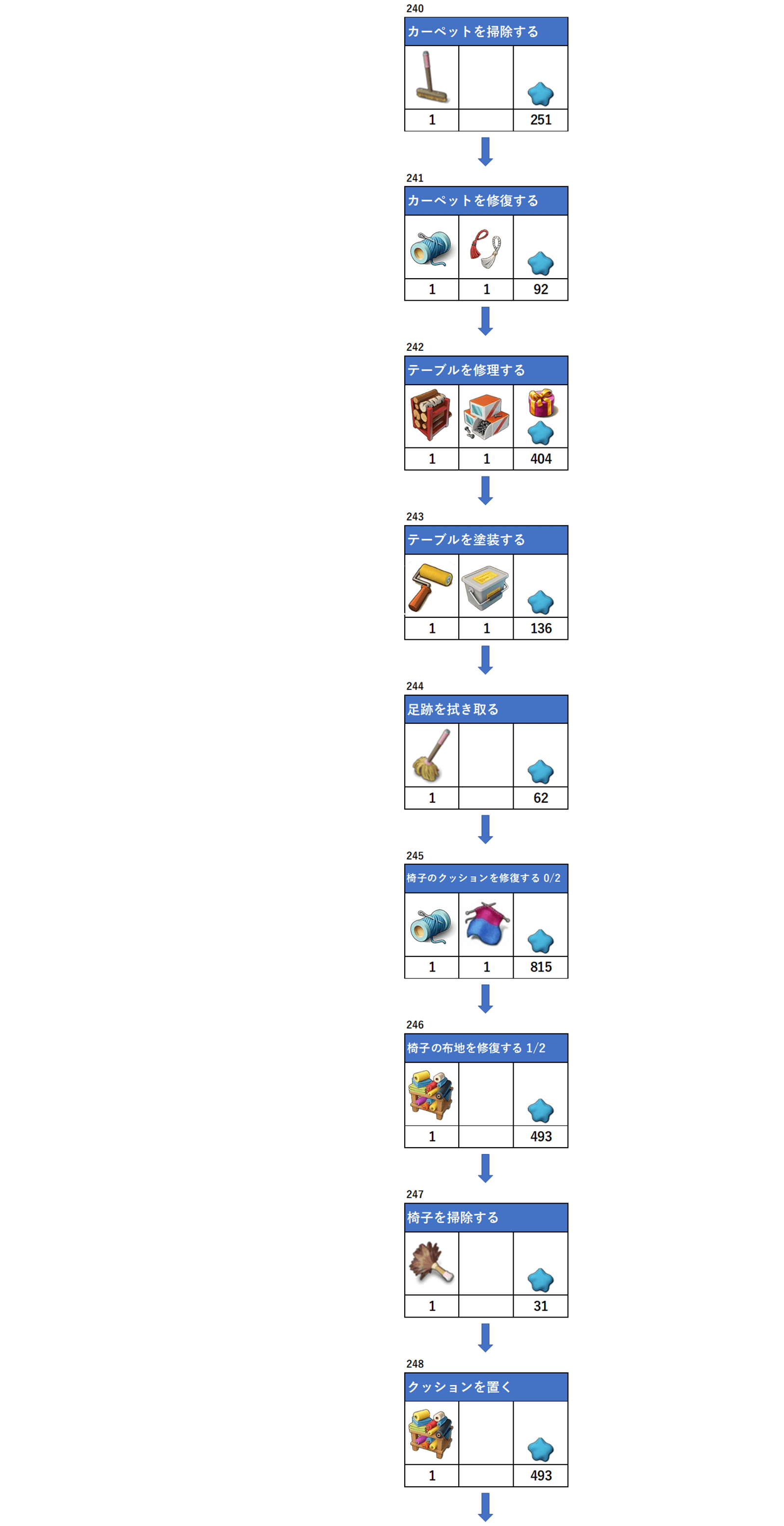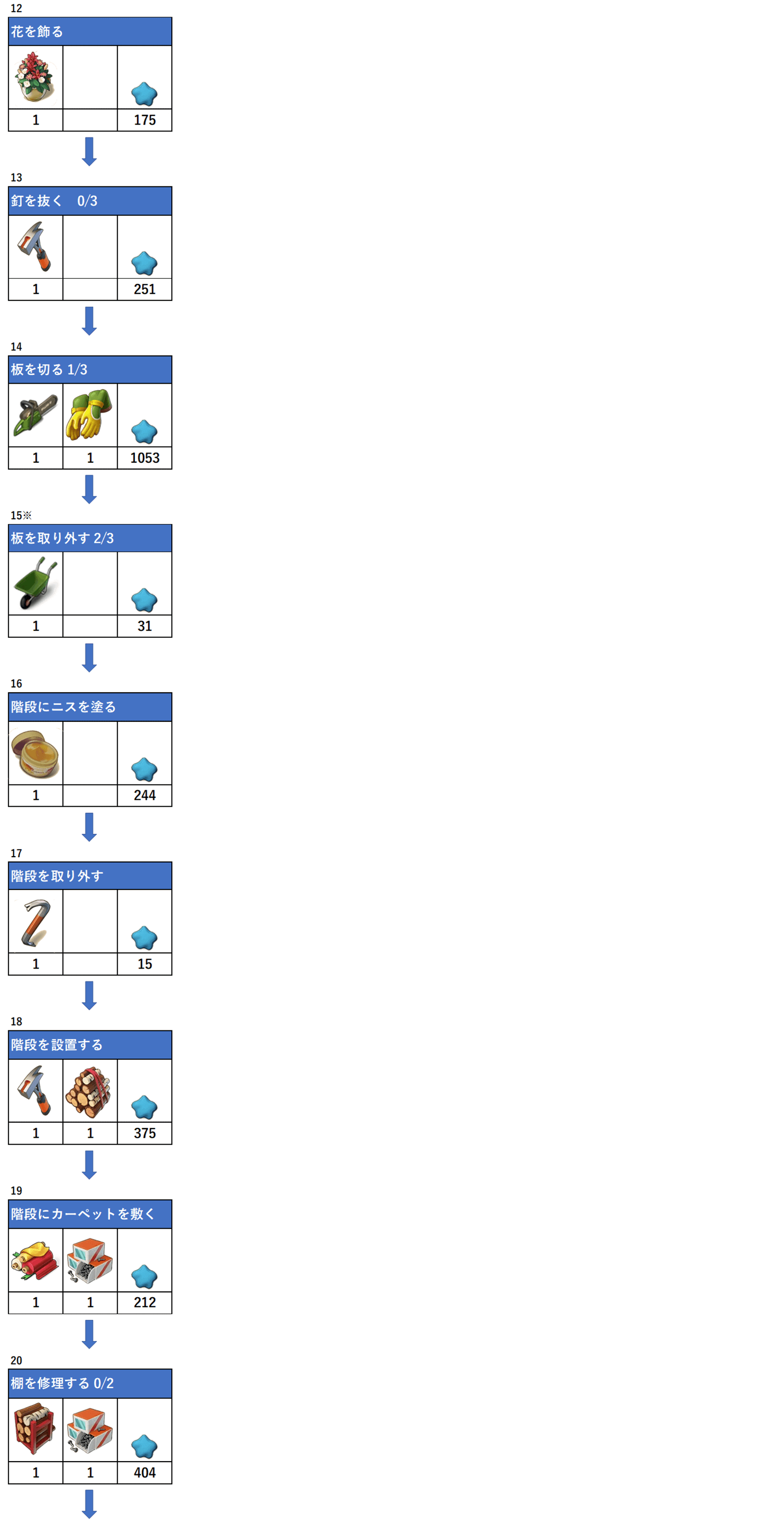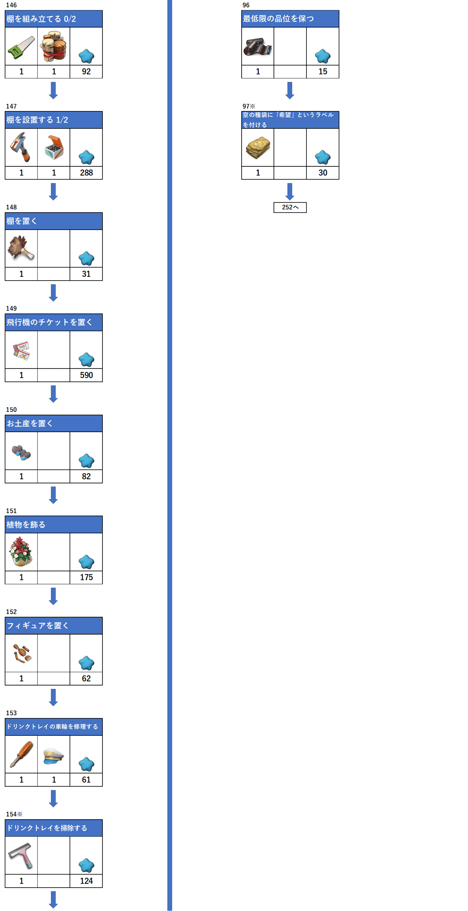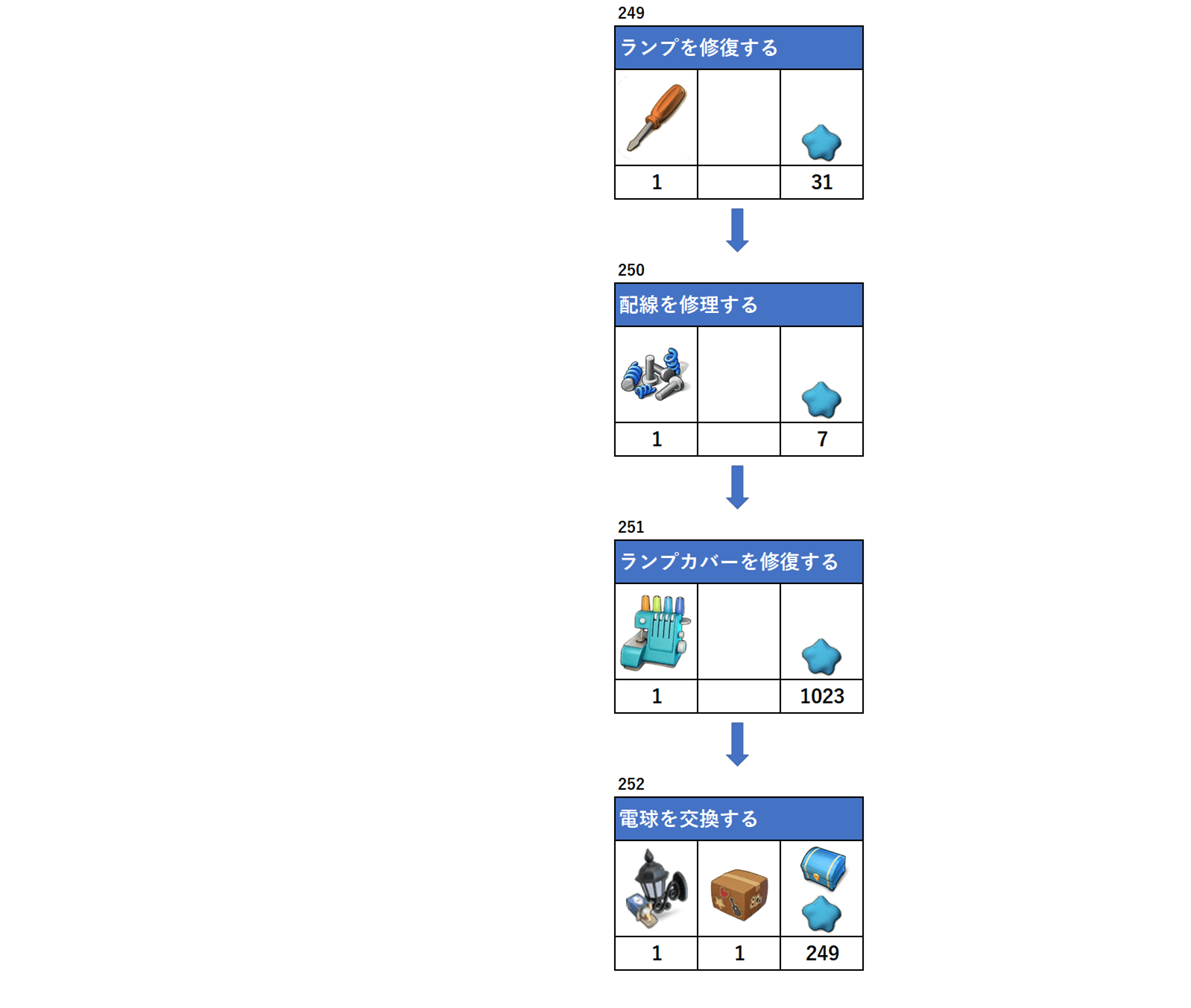 アイテムの下にある数字は必要数、一番右枠は報酬となります。