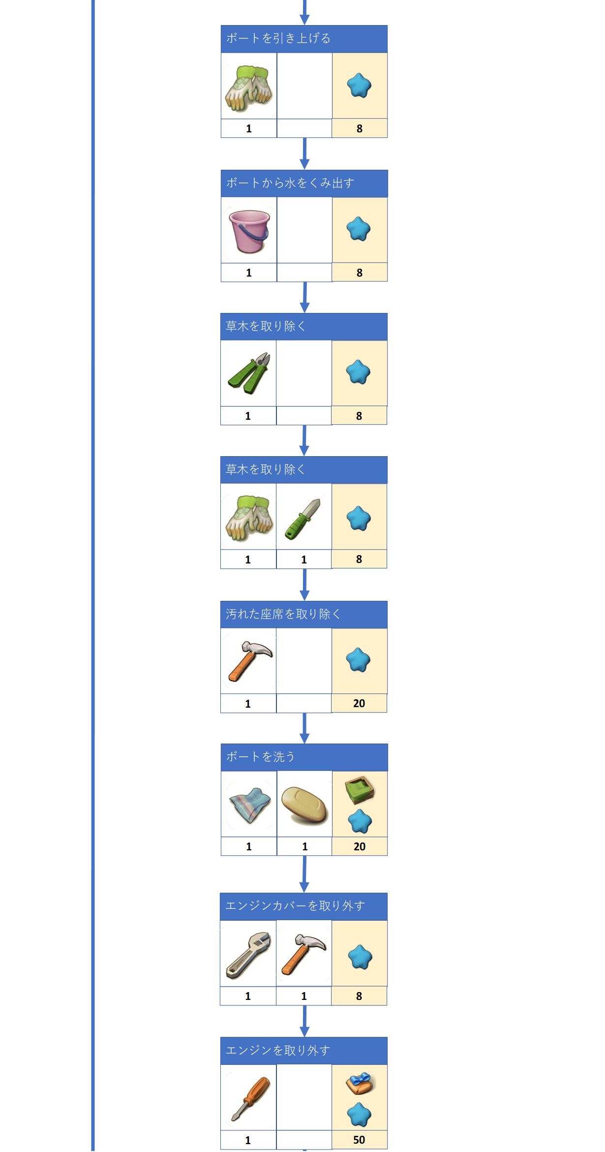 マージマンション(Merge Mansion)のエリア、船着き場の攻略用フローチャートとアイテム必要数です。