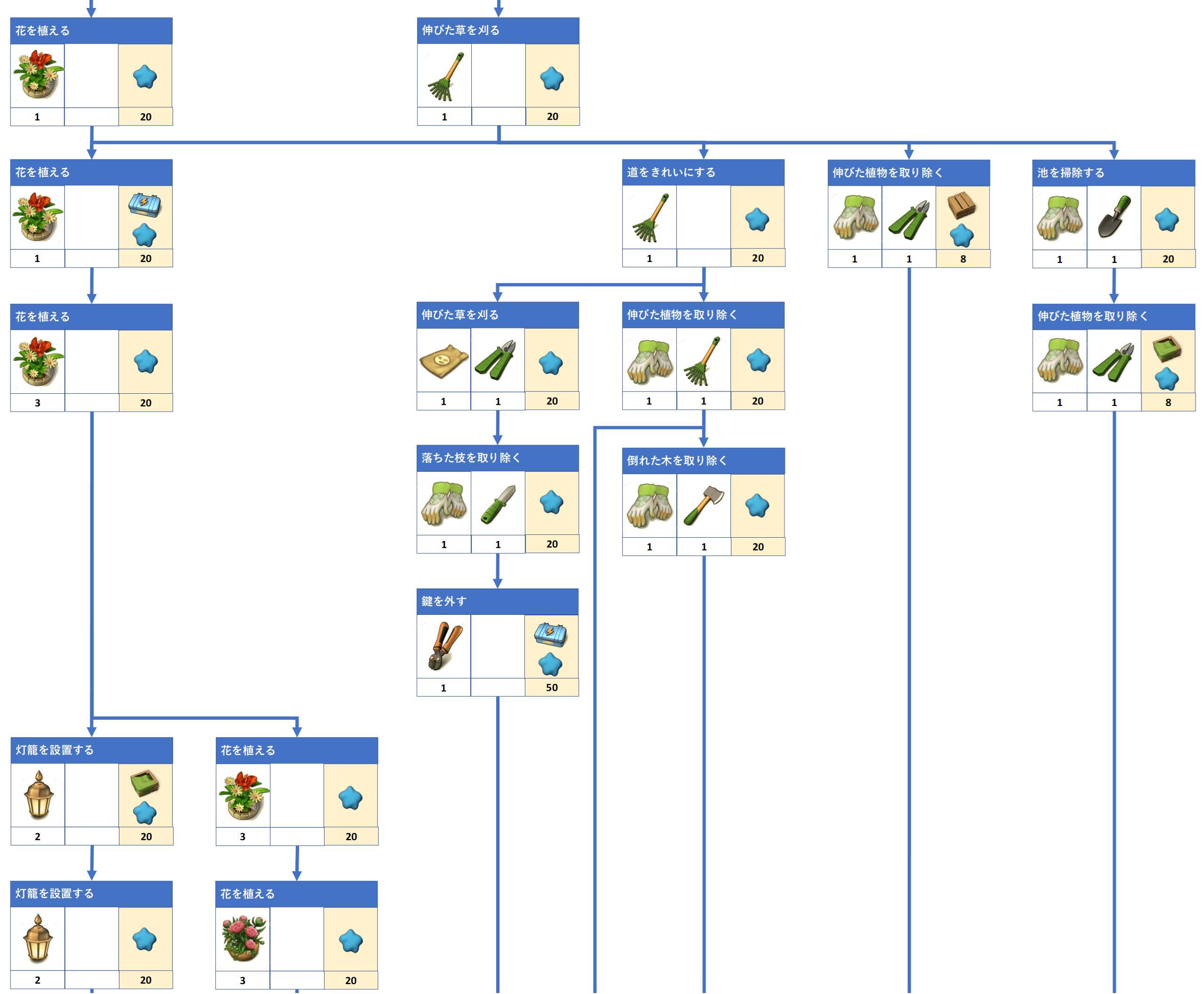 マージマンション(Merge Mansion)のエリア、石庭の攻略用フローチャートとアイテム必要数です。