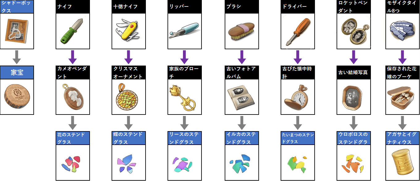 アイテムの下にある数字は必要数、一番右枠は報酬となります。